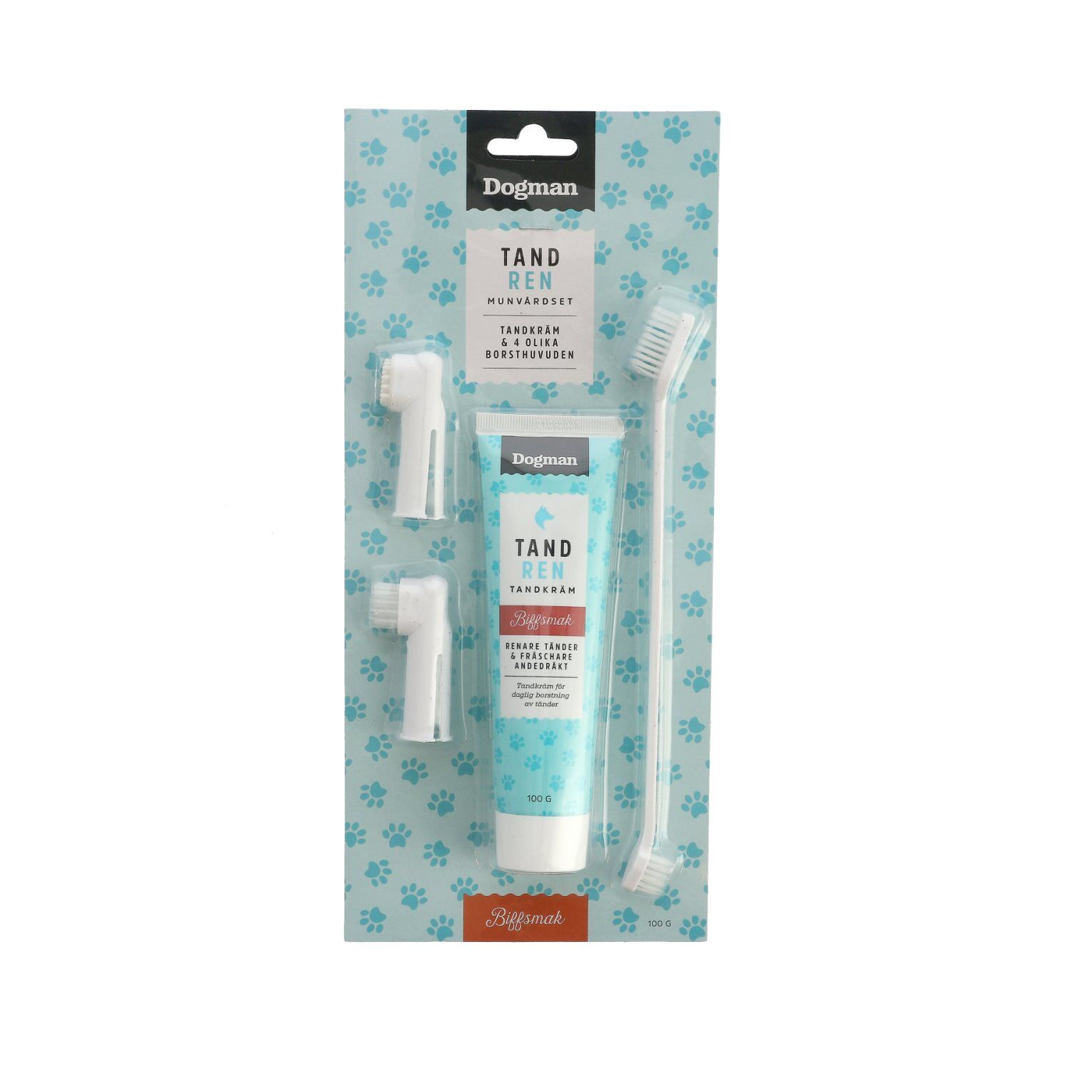 Dette sæt indeholder en 100g tandpasta med smag af bøf, som giver renere tænder og bedre åndedræt. Med dette tandplejesæt kan man enten vælge at bruge tandbørsten eller en af fingertansbørsterne til at børste hundens tænder med. Der medfølger to fingertandbørster i forskelligt design.