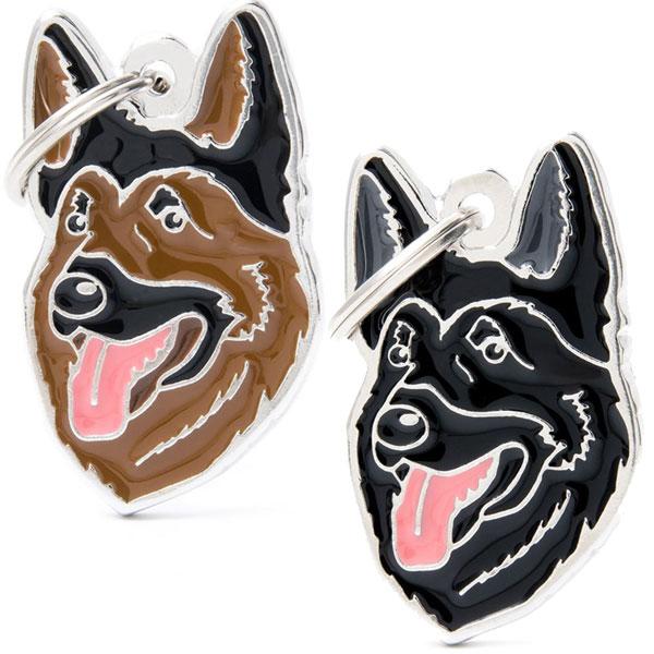 Hundetegn MyFamily Schæferhund er et flot tegn, som måler ca. 2,5 x 4,3 cm. Hundetegnet er fremstillet i massivt håndpoleret aluminium, og er derfor i en rigtig god kvalitet. Emaljen er desuden allergivenlig og uden nikkel, og derfor kan du med god samvittighed putte dette hundetegn på din hunds halsbånd. MyFamily er generelt kendt for at lave kvalitetshundetegn i alverdens designs, og derfor er dette hundetegn naturligvis ikke en undtagelse.