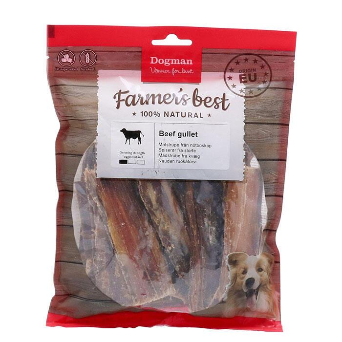 Dogman Farmers Best Beef Gullet, kommer i en pose med 200g. Posen har genluk så de kan holde sig friske efter åbning. Da dette er et rent naturprodukt kan farve og størrelse på de enkelte stykke variere.