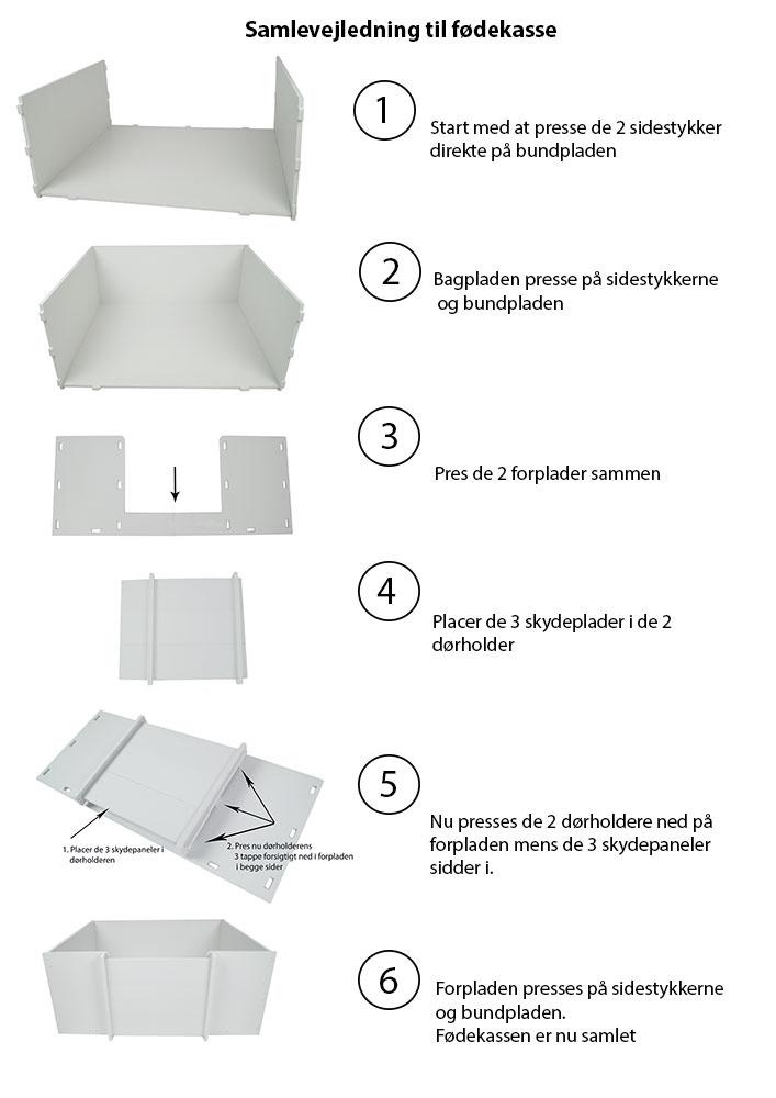 Fødekassen består af 11 stykker, der samles via tapsamlinger - Der SKAL udvises ekstrem forsigtighed under samling af kassen, da brud ikke er omfattet af reklamationsret.