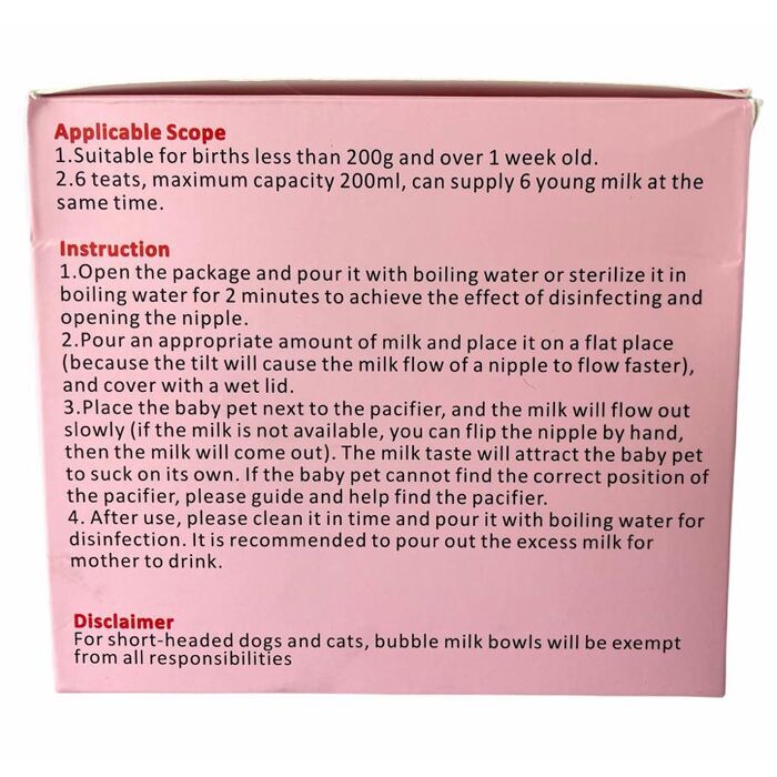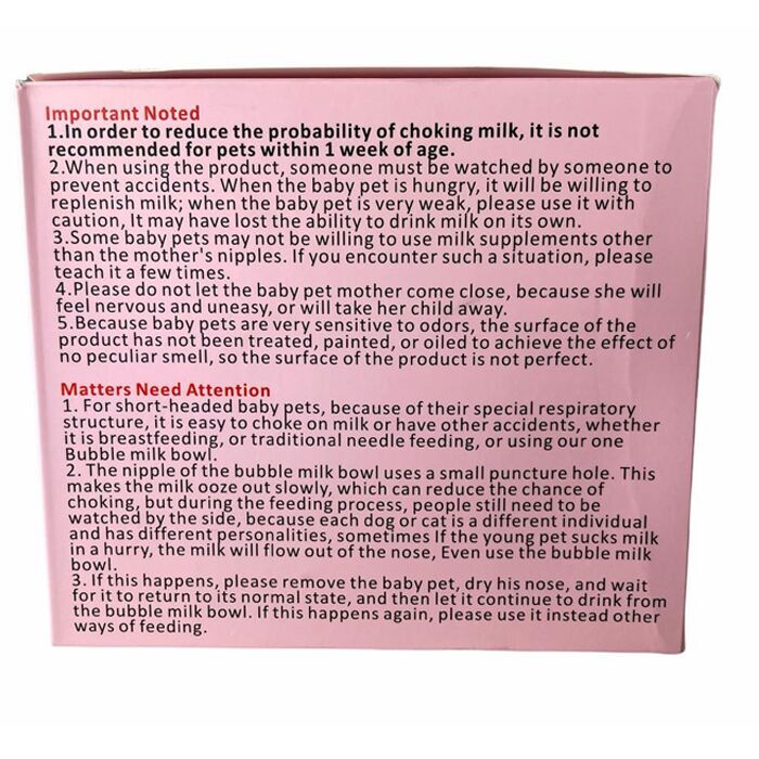 Pet baby Bubble Milk Bottles er en ideel løsning til nyfødte hundehvalpe og kattekillinger fra 1 ugers alderen, der af den ene eller anden grund ikke kan blive tilstrækkeligt diet fra moderdyret. Dette kan være grundet dødsfald eller simpelthen mangel på mælk eller mangel på dievorter ved et stort antal hvalpe eller killinger. Det er hermed eneste løsning på markedet, der reelt kan bruges i stedet for et ammedyr i tilfælde af dødsfald af moderdyret.