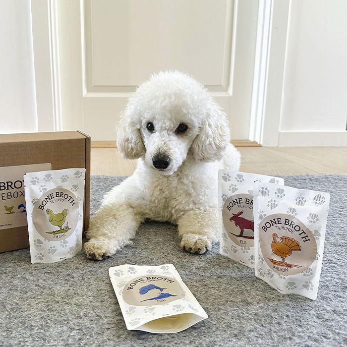Men Bone Broth er ikke kun fantastisk på grund af sin nedkølende effekt. Det hjælper også med at opretholde væskebalancen. Du kan blot hælde en smule af indholdet fra posen i din hunds vand og se, hvordan den ivrigt drikker det i sig.
