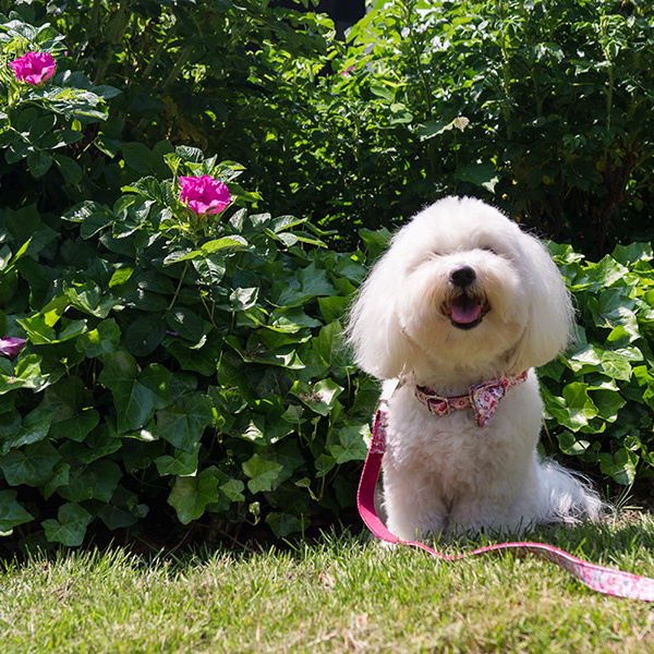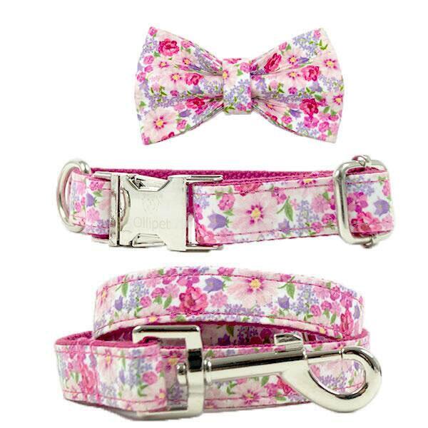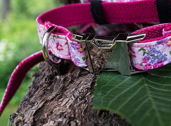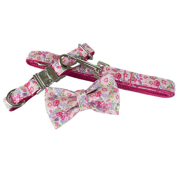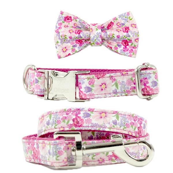 Håndlavet halsbånd og linesæt fra Ollipet serien CitySeen med aftagelig sløjfe - til hverdag og fest i sød lyserød småblomst