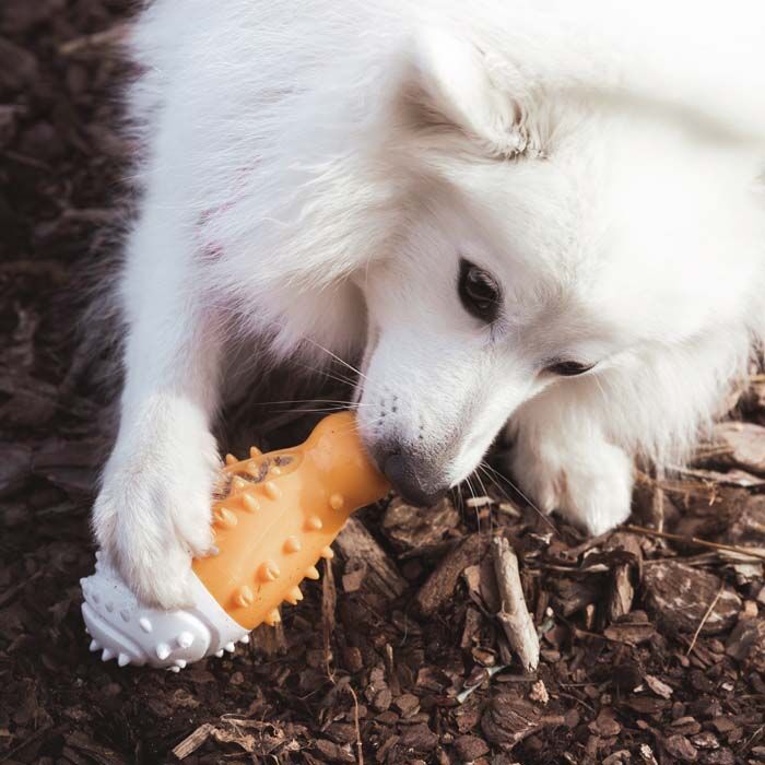 Aktivitets kyllingelår i TPR gummi, med tandrensende effekt.