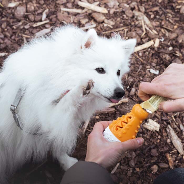Yderligere kan dette multifunktionelle hundelegetøj anvendes, som et afkølende legetøj. Den hvide top kan fyldes med vand, derefter lægges den i fryseren i nogle timer. Nu har du et sjovt tyggelegetøj der fungere både nedkølende og tørstslukkende.