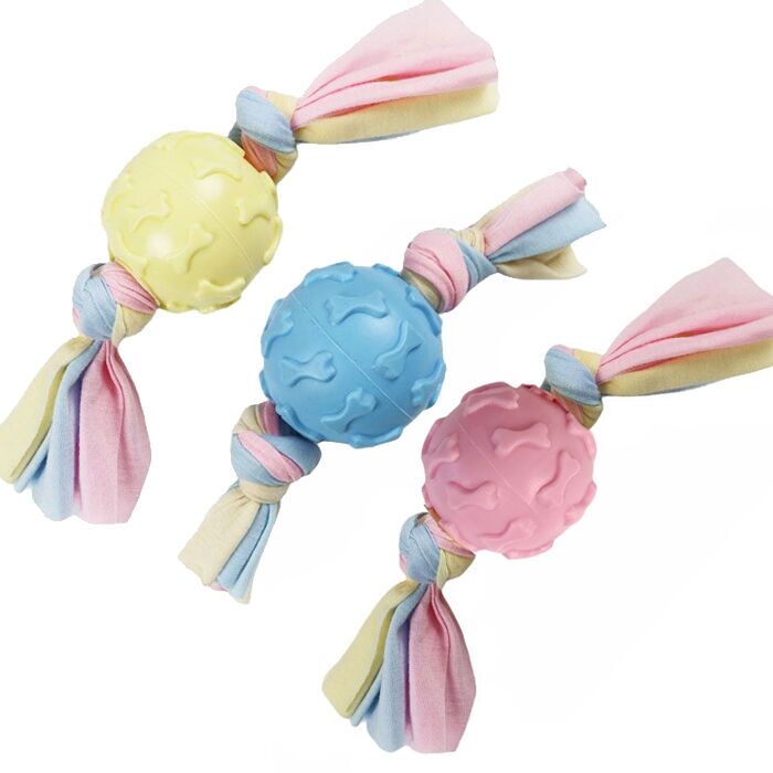 Denne fine lille bold med 2 tilhørende fletsnore, kommer i 3 farvevarianter, og er velegnet til enhver hundeejer med lille hund, eller hvalp. Bolden i sig selv måler ca. 6 cm i diameter, og med begge snore måler den 20 cm.
