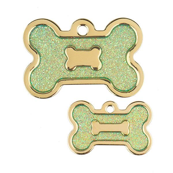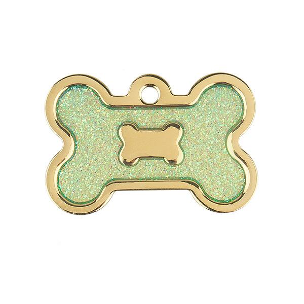 Hundetegnet har en smuk lysegrøn glimmer indrammet i et guld kødben, som skaber et subtilt og unikt udseende. Det tilføjer en ekstra touch af stil til hundens halsbånd. Samlet set er dette eksklusive hundetegn i guld med lys grøn glimmer en stilfuld og personlig måde at identificere din hund på.