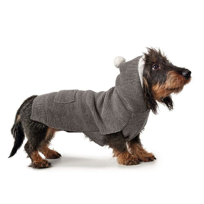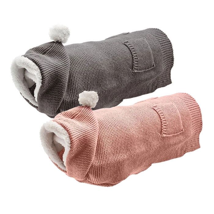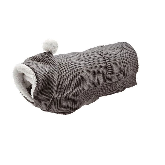 Strik-pulloveren har desuden flere fine detaljer, såsom små søde lommer i den bagerste del af pulloveren, samt en fin hætte beklædt med blødt for og en sød lille kvast, der garanterer at din hund, på mest behagelige vis, kommer til at holde varmen, alt imens den ser bedårende ud.
