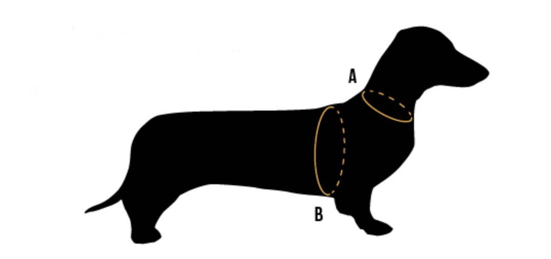 For at finde den rette størrelse til din hund, måler du hals(a), samt brystomkreds (b):