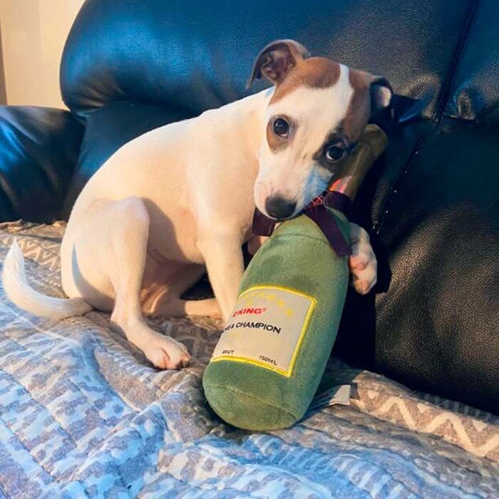 Flasken er blød og hunden kan altså, modsat en ægte flaske, ikke slå sig på den. Champagneflasken indeholder et piv-dyr som helt sikker vil sætte ekstra gang i festen.