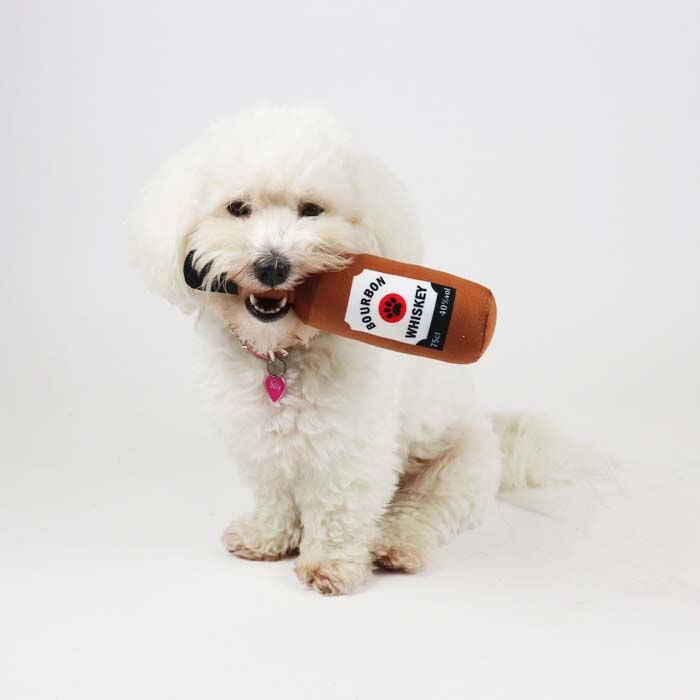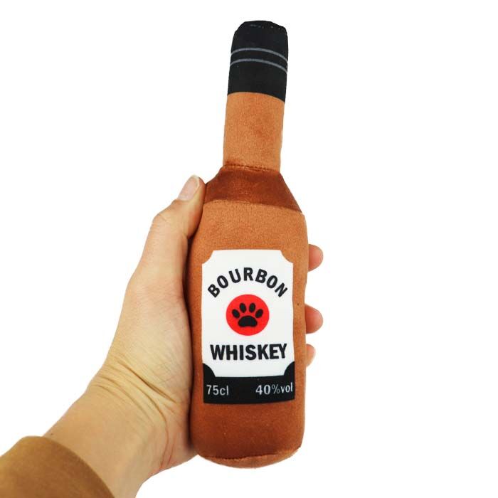 Skal du holde fest sammen med din hund, så kan den sjove Whiskey Bourbon Plysflaske være lige det du søger.