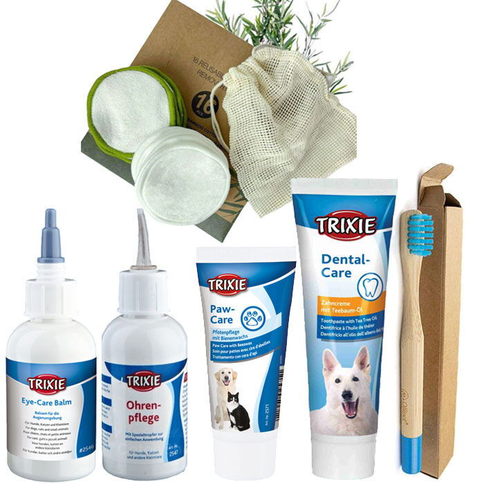 - Indeholder produkter til pleje af poter, ører, øjne og tænder