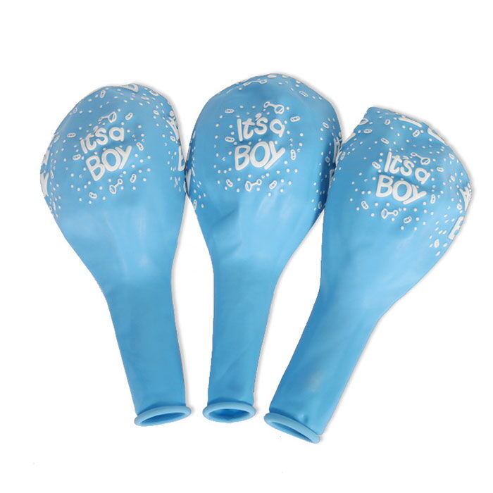 Pakken indeholder 10 latexballoner i lyserød med teksten "It's a girl" eller i blå med teksten "It's a boy".
