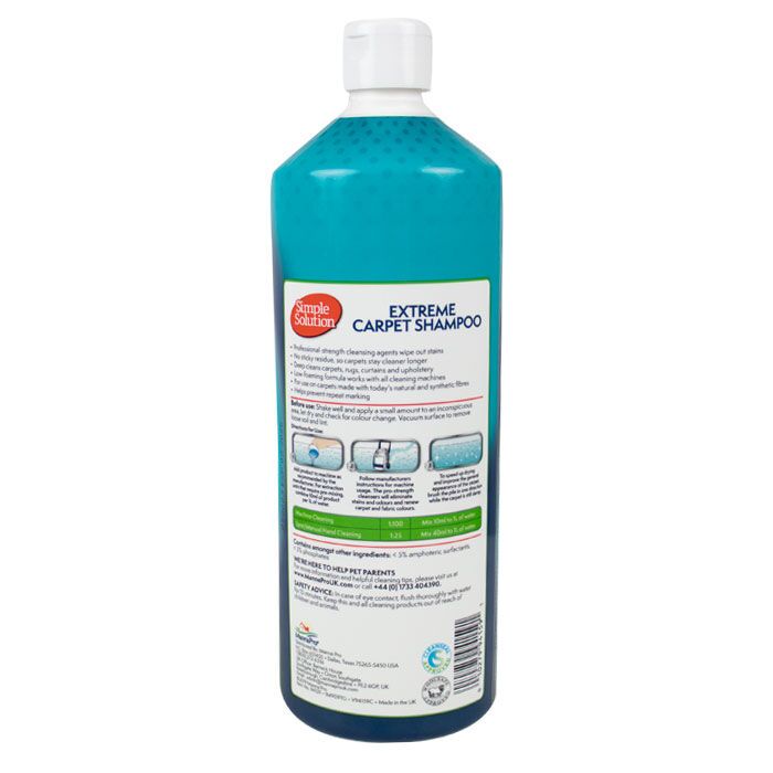 Kender du det, når uheldet er ude og dit kæledyr har lavet så genstridige pletter på gulvtæppet, som bare ikke er til at fjerne? Så er EXTREME Carpet Shampoo fra Simple Solution et godt og uundværligt rengøringsmiddel til at rense tæppet. Tæppeshampooen er udviklet til at rense tæpper, forhæng og polstring i dybden med patenteret lugtneutraliserende teknologi.