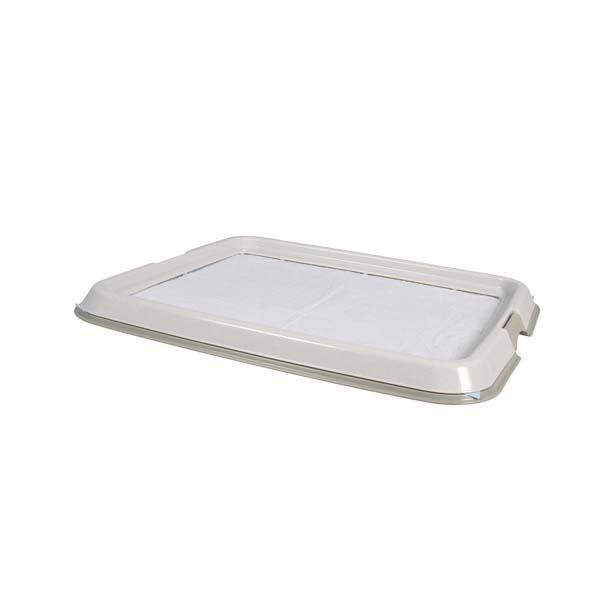 Hygiejnisk hvalpetoilet i hvid plastik. Hvalpetoilettet har en praktisk aftagelig ramme og skridsikre gummifødder.