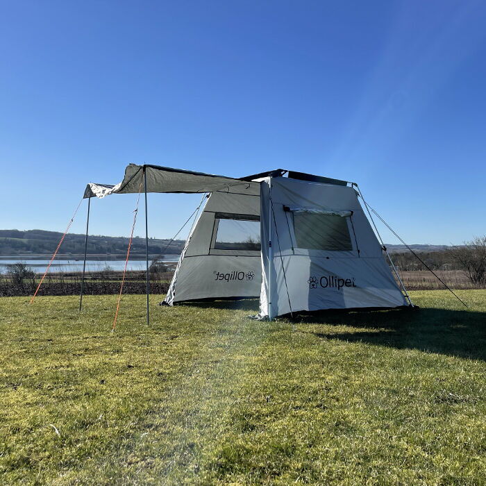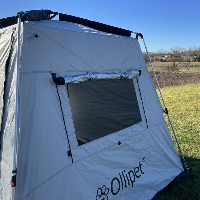 Ollipet hundeudstillingstelt er din perfekte base og arbejdsplads under hundeudstillingen. Med et mål på 2,5 x 2,5 meter samt 190 cm indvendig højde på midten er der rigeligt plads til dig som udstiller, dit groomingbord og hvad du ellers har brug for. Teltet er forsynet med to vinduer med myggenet og udvendigt "gardin", der fastgøres ved hjælp af velcro. Gardinet rulles blot sammen og fastgøres udvendigt, når du ønsker ventilation. Teltet er forsynet med en stor indgang i fronten og bagpå. Disse er forsynet med lynlås samt overlapning med velcro, så evt. regn ikke trænger ind, når dørene er lynet for. Der medfølger to ekstra stålstænger samt bardunsnore, du kan bruge til at sætte døren op som et solsejl, du kan sidde under.