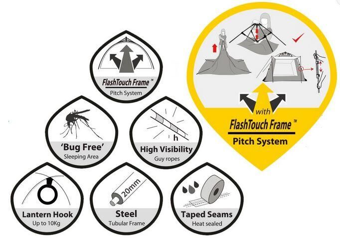 Teltet er et letvægtstelt på kun cirka 8 kilo. Det er fremstillet i kraftig nylon med et varmeafvisende lag, så du undgår overophedning i teltet. Alle syninger og kanter er forstærket. Teltet er opbygget om en solid konstruktion af sortlakerede stålstænger med forstærkede led i slagfast plast.