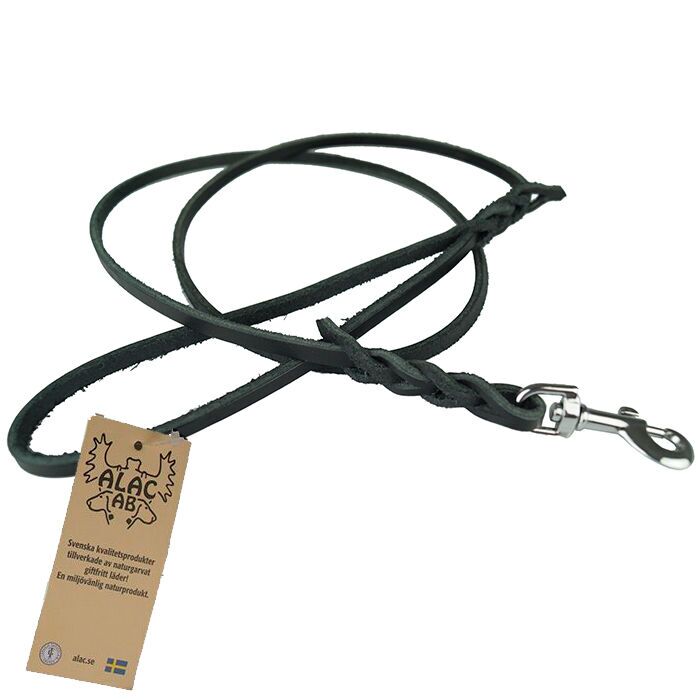 Den sorte læderline findes i 2 længder og 2 bredder. Linen anbefales til mindre og mellemstore hunde.