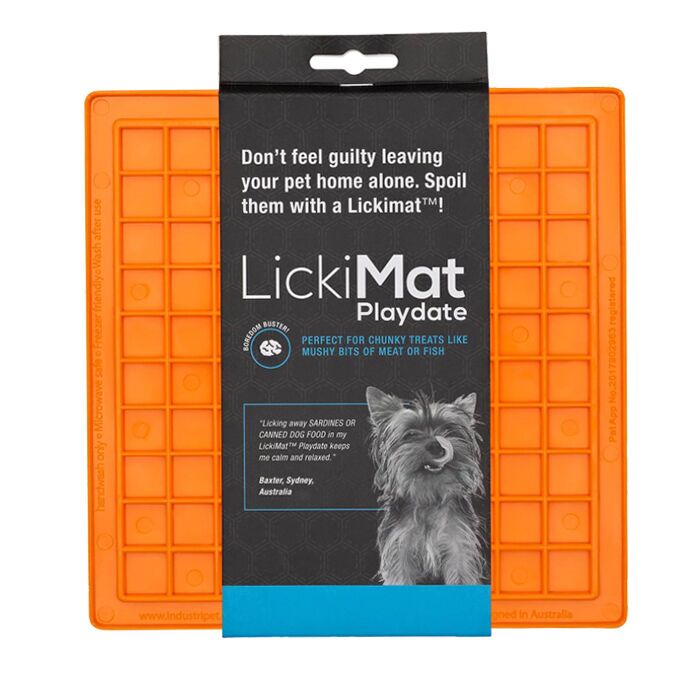 Med LickiMat Playdate vil din hund/kat skulle arbejde med sin tunge, rundt i alle hjørner af de mange firkanter. Den vil blive underholdt i lang tid, og slet ikke bemærke hvad der sker omkring den imens. Det giver en god afslappende effekt på hunde/katte. Når de slikker på pladen bliver tungen stimuleret og det skaber afslappende endorfiner i kroppen.