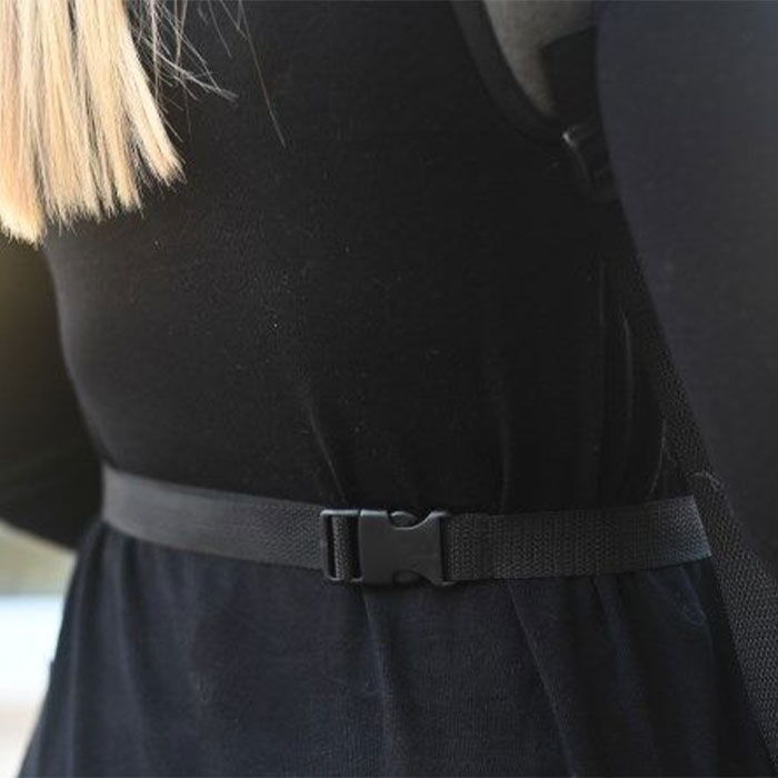 Tasken har derudover et regulerbart bælte, der kan spændes omkring maven, for at tasken sidder mere behageligt.