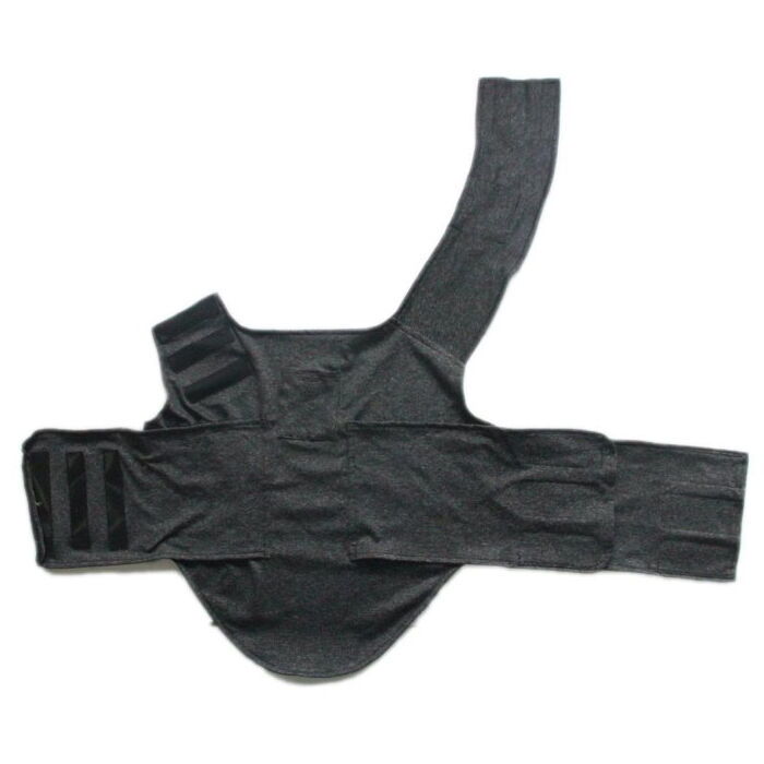 Start med at placere dragten over din hunds ryg og vikl den korte bryststrop under hundens brystkasse. Vikl herefter den lange bryst stop under hundens brystkasse, og fastgør den til den korte strop. Efterfølgende vikler du de øverste bryststropper under hundens brystkasse og justerer dem, så dragten sidder tæt til hundens krop.