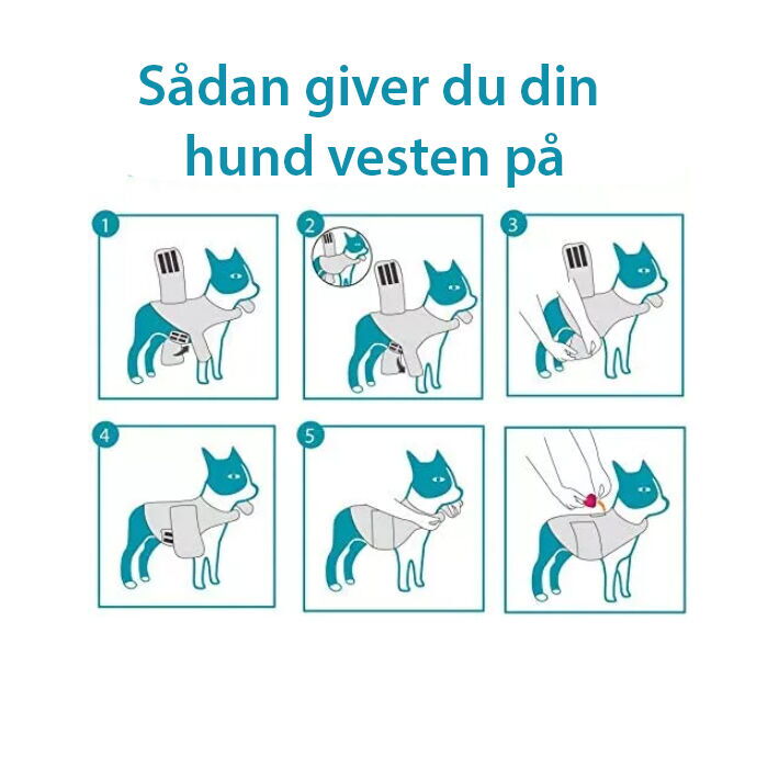 Vi anbefaler desuden, at du lader hunden prøve dragten i en rolig situation, de første gange den har den på. Hvis du udelukkende giver hunden dragten på, når den er utilpas, vil den begynde at associere Anti-angst-dragten med ubehag, og på sigt vil du risikere, at hunden bliver bange for den.