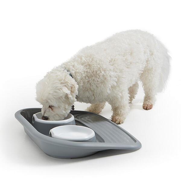 Rengøringsvenlig madbar med to skåle. Her kan din hund eller kat i ro og mag spise sit foder og drikke vand - og du undgår samtidig, at der kommer mad og vand på gulvet.