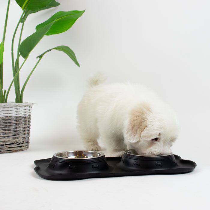 Nu kan din hund få sit helt eget spisesæt med indbygget spiseunderlag, der beskytter gulvet mod vand og foderrester.