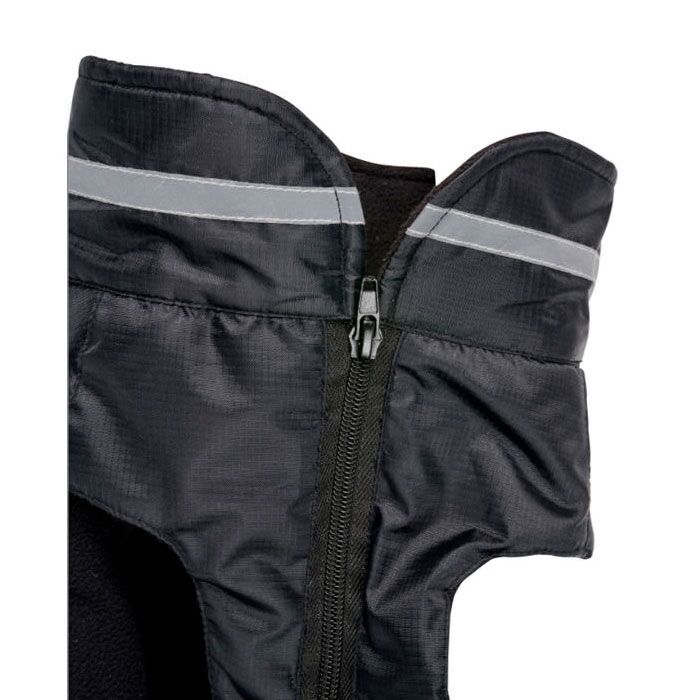 Vinterjakken har dobbelte lynlås på ryggen og åbning i nakken, så uanset om hunden bruger sele eller halsbånd kan den have det på indenunder jakken.