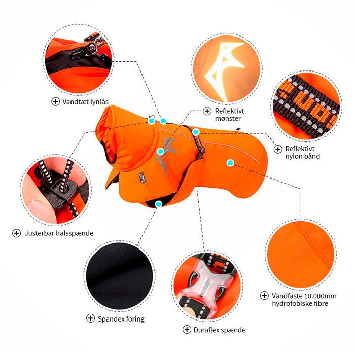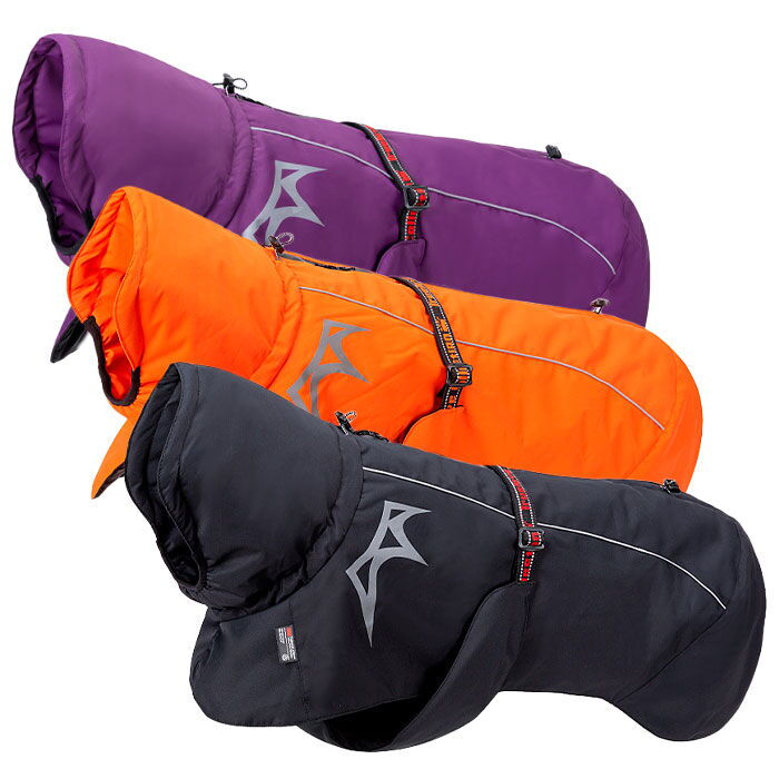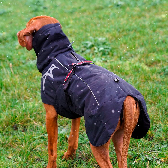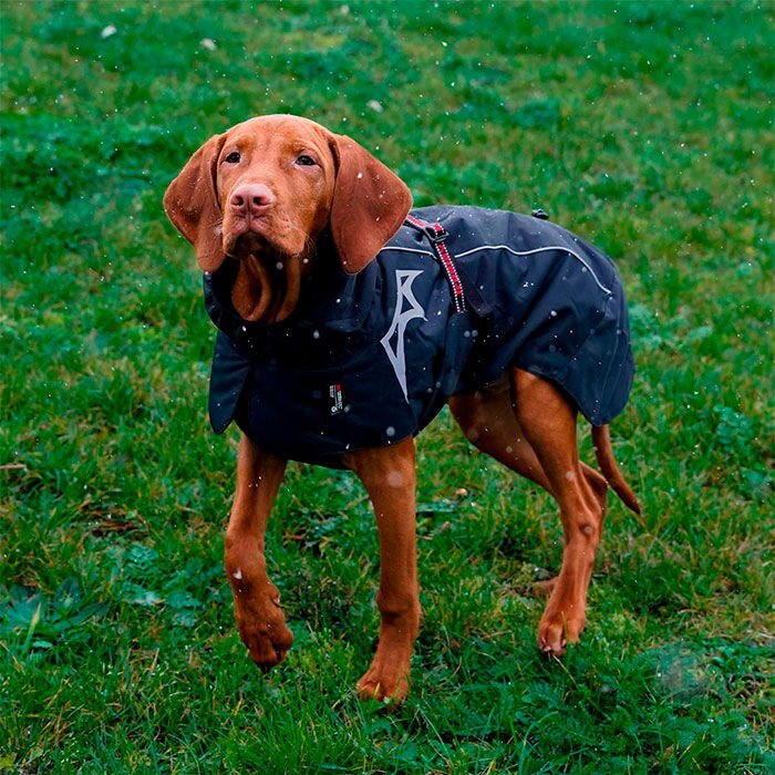 Jakken går godt op omkring halsen, dækker både bryst og baglår godt, og beskytter derfor de mest nødvendige muskelgrupper på hunden. Pasformen er ekstrem god, og giver hunden maksimal bevægelsesfrihed, således at den stadig kan bevæge sig frit på jeres ture.
