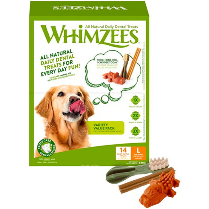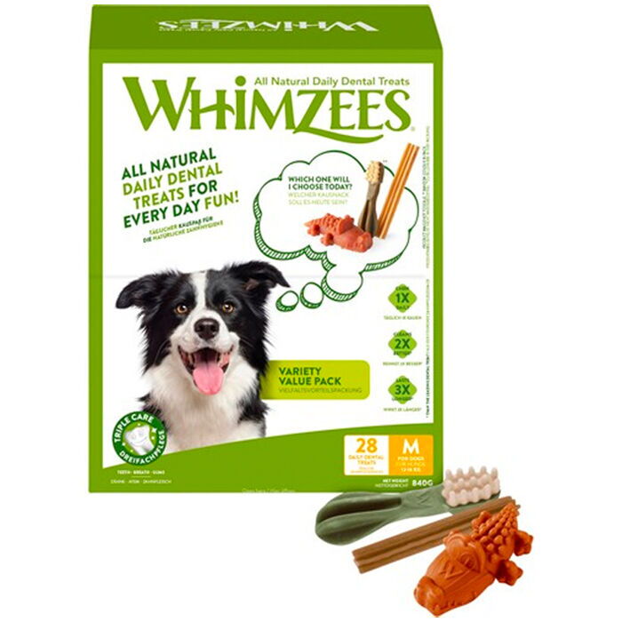 Whimzees Variety Bokse er blandet med deres tyggeben i forskellige varianter, så du kan veksle imellem hvilken variant du giver.