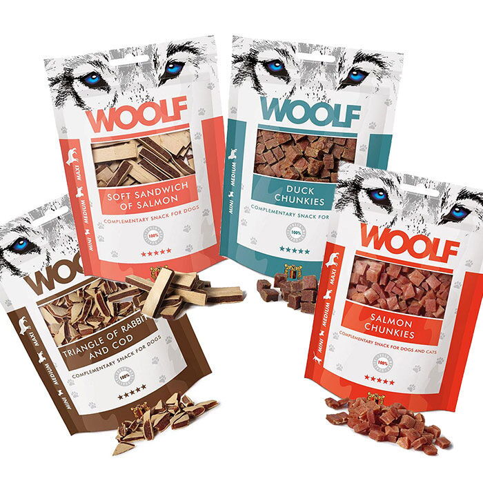 - WOOLF Soft Sandwich Of Salmon Sammensætning: laks 80%, torsk 10%, mineraler, stivelse og glycerin Analyse: råprotein 30%, råfedt 8%, råfibre 1%, råaske 6%, vand 18%